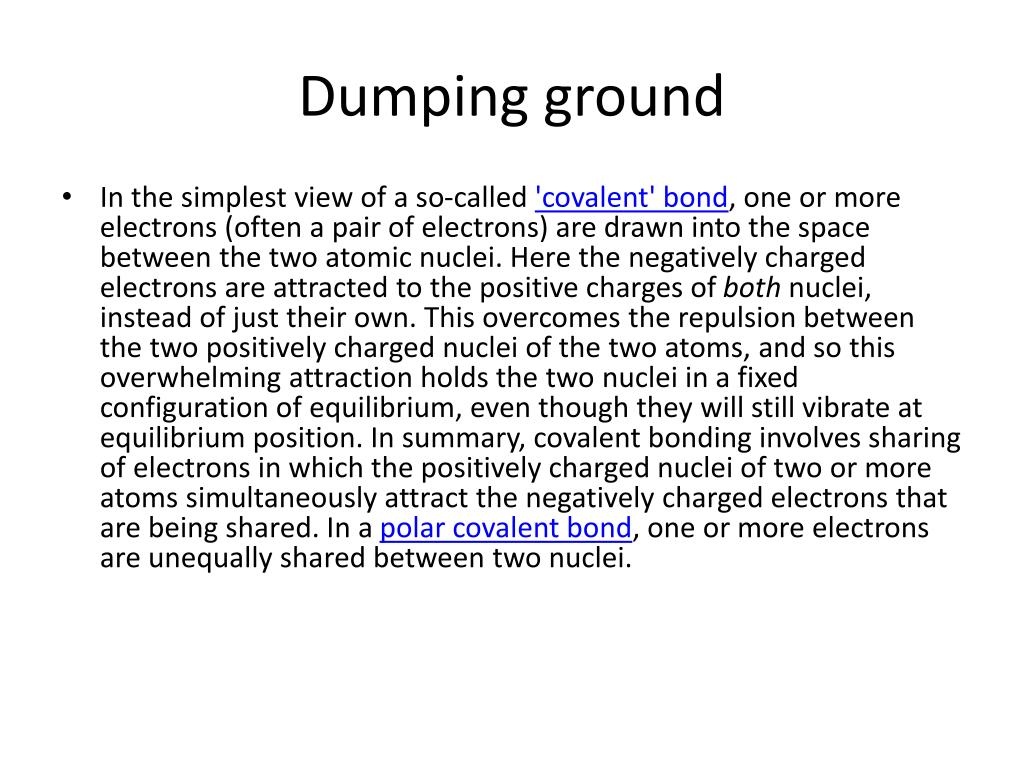 Dumping ground • In the simplest view of a so-called 'covalent' bond, one or more electrons (often a pair of electrons) are drawn into the space between the two atomic nuclei. Here the negatively charged electrons are attracted to the positive charges of both nuclei, instead of just their own. This overcomes the repulsion between the two positively charged nuclei of the two atoms, and so this overwhelming attraction holds the two nuclei in a fixed configuration of equilibrium, even though they will still vibrate at equilibrium position. In summary, covalent bonding involves sharing of electrons in which the positively charged nuclei of two or more atoms simultaneously attract the negatively charged electrons that are being shared. In a polar covalent bond, one or more electrons are unequally shared between two nuclei.