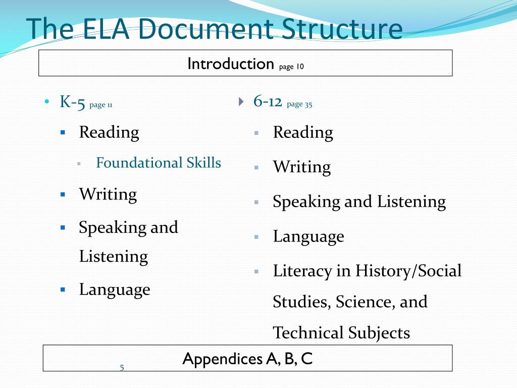 The ELA Document Structure Introduction page 10 • 6-12 page 35 • Reading • Writing • Speaking and Listening • Language • Literacy in History/Social Studies, Science, and Technical Subjects Appendices A, B, C • K-5 page 11 • Reading • Foundational Skills • Writing • Speaking and Listening • Language