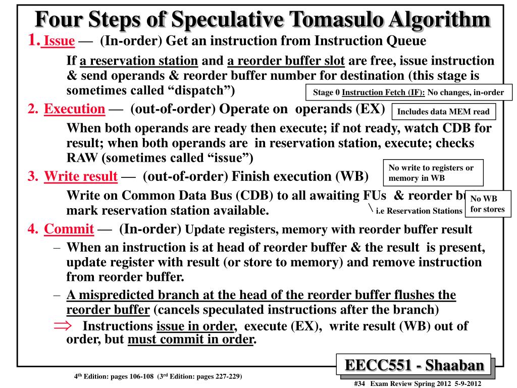 Four Steps of Speculative Tomasulo Algorithm 1.Issue— (In-order) Get an instruction from Instruction Queue If a reservation station and a reorder buffer slot are free, issue instruction & send operands & reorder buffer number for destination (this stage is sometimes called “dispatch”) 2. Execution— (out-of-order) Operate on operands (EX) When both operands are ready then execute; if not ready, watch CDB for result; when both operands are in reservation station, execute; checks RAW (sometimes called “issue”) 3. Write result— (out-of-order) Finish execution (WB) Write on Common Data Bus (CDB) to all awaiting FUs & reorder buffer; mark reservation station available. 4. Commit— (In-order) Update registers, memory with reorder buffer result • When an instruction is at head of reorder buffer & the result is present, update register with result (or store to memory) and remove instruction from reorder buffer. • A mispredicted branch at the head of the reorder buffer flushes the reorder buffer (cancels speculated instructions after the branch) • Instructions issue in order, execute (EX), write result (WB) out of order, but must commit in order. Stage 0 Instruction Fetch (IF): No changes, in-order Includes data MEM read No write to registers or memory in WB No WB for stores i.e Reservation Stations 4th Edition: pages 106-108 (3rd Edition: pages 227-229)