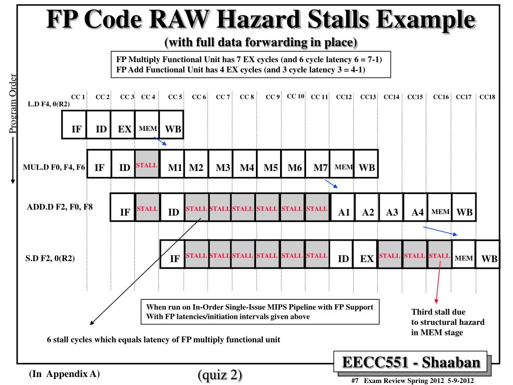 CC 10 CC 1 CC 2 CC 3 CC 4 CC 5 CC 6 CC 7 CC 8 CC 9 CC 11 CC12 CC13 CC14 CC15 CC16 CC17 CC18 Program Order IF ID M1 M2 M3 M4 M5 M6 M7 WB MEM IF ID A1 A2 A3 A4 WB MEM IF ID EX WB MEM IF ID EX WB MEM STALL STALL STALL STALL STALL STALL STALL STALL STALL STALL STALL STALL STALL STALL STALL STALL STALL FP Code RAW Hazard Stalls Example(with full data forwarding in place) FP Multiply Functional Unit has 7 EX cycles (and 6 cycle latency 6 = 7-1) FP Add Functional Unit has 4 EX cycles (and 3 cycle latency 3 = 4-1) L.D F4, 0(R2) MUL.D F0, F4, F6 ADD.D F2, F0, F8 S.D F2, 0(R2) When run on In-Order Single-Issue MIPS Pipeline with FP Support With FP latencies/initiation intervals given above Third stall due to structural hazard in MEM stage 6 stall cycles which equals latency of FP multiply functional unit (quiz 2) (In Appendix A)