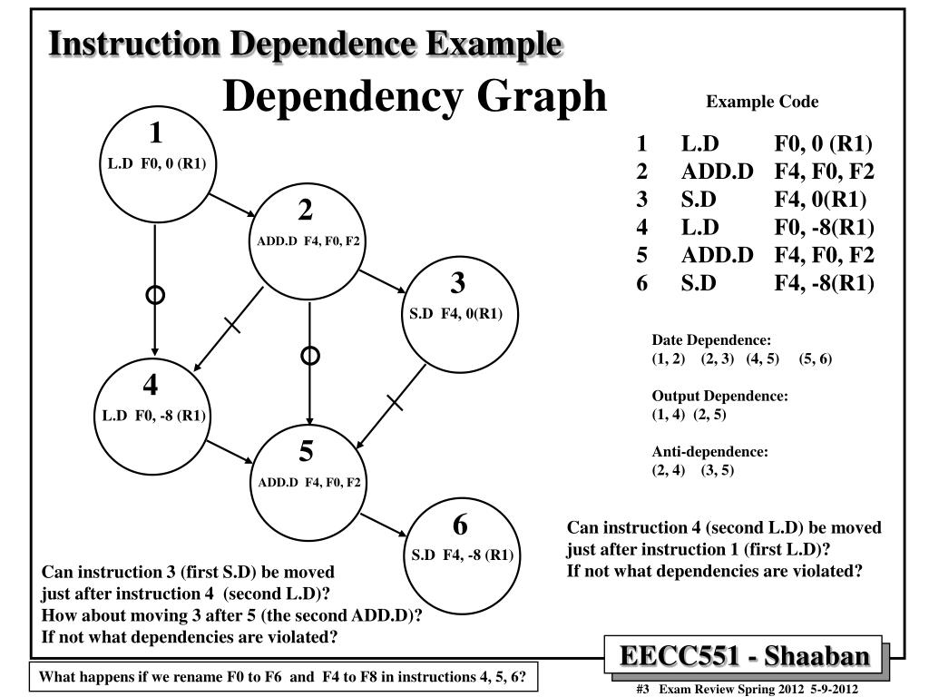 1 2 3 4 5 6 L.D F0, 0 (R1) ADD.D F4, F0, F2 S.D F4, 0(R1) L.D F0, -8(R1) ADD.D F4, F0, F2 S.D F4, -8(R1) 1 2 3 6 5 4 S.D F4, -8 (R1) L.D F0, -8 (R1) S.D F4, 0(R1) L.D F0, 0 (R1) ADD.D F4, F0, F2 ADD.D F4, F0, F2 Instruction Dependence Example Dependency Graph Example Code Date Dependence: (1, 2) (2, 3) (4, 5) (5, 6) Output Dependence: (1, 4) (2, 5) Anti-dependence: (2, 4) (3, 5) Can instruction 4 (second L.D) be moved just after instruction 1 (first L.D)? If not what dependencies are violated? Can instruction 3 (first S.D) be moved just after instruction 4 (second L.D)? How about moving 3 after 5 (the second ADD.D)? If not what dependencies are violated? What happens if we rename F0 to F6 and F4 to F8 in instructions 4, 5, 6?