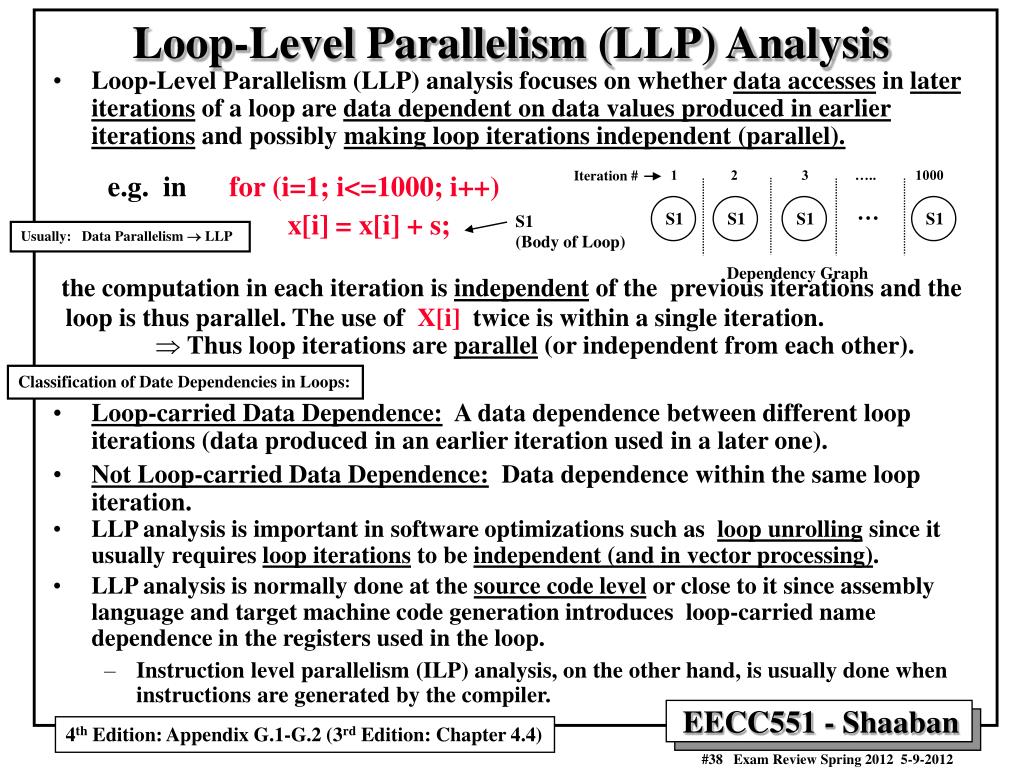 A[1] = A[1] + B[1]; B[2] = C[1] + D[1]; A[99] = A[99] + B[99]; B[100] = C[99] + D[99]; A[2] = A[2] + B[2]; B[3] = C[2] + D[2]; A[100] = A[100] + B[100]; B[101] = C[100] + D[100]; LLP Analysis Example 2 for (i=1; i<=100; i=i+1) { A[i] = A[i] + B[i]; /* S1 */ B[i+1] = C[i] + D[i]; /* S2 */ } Original Loop: Iteration 99 Iteration 100 Iteration 1 Iteration 2 . . . . . . . . . . . . S1 S2 Loop-carried Dependence • A[1] = A[1] + B[1]; • for (i=1; i<=99; i=i+1) { • B[i+1] = C[i] + D[i]; • A[i+1] = A[i+1] + B[i+1]; • } • B[101] = C[100] + D[100]; Modified Parallel Loop: (one less iteration) Iteration 98 Iteration 99 . . . . Iteration 1 Loop Start-up code A[1] = A[1] + B[1]; B[2] = C[1] + D[1]; A[99] = A[99] + B[99]; B[100] = C[99] + D[99]; A[2] = A[2] + B[2]; B[3] = C[2] + D[2]; A[100] = A[100] + B[100]; B[101] = C[100] + D[100]; Not Loop Carried Dependence Loop Completion code