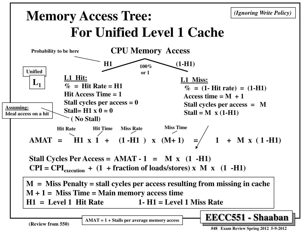 (Ignoring Write Policy) Memory Access TreeFor Separate Level 1 Caches CPU Memory Access Split 1 or 100% L1 % data % Instructions Instruction Data %instructions x Instruction H1 ) %instructions x (1 - Instruction H1 ) % data x Data H1 % data x (1 - Data H1 ) Instruction L1 Hit: Hit Access Time = 1 Stalls = 0 Instruction L1 Miss: Access Time = M + 1 Stalls Per access = M Stalls =%instructions x (1 - Instruction H1 ) x M Data L1 Hit: Hit Access Time: = 1 Stalls = 0 Data L1 Miss: Access Time = M + 1 Stalls per access: M Stalls = % data x (1 - Data H1 ) x M Assuming: Ideal access on a hit, no stalls Assuming: Ideal access on a hit, no stalls Stall Cycles Per Access = % Instructions x ( 1 - Instruction H1 ) x M + % data x (1 - Data H1 ) x M AMAT = 1 + Stall Cycles per access Stall cycles per instruction = (1 + fraction of loads/stores) x Stall Cycles per access CPI = CPIexecution + Stall cycles per instruction = CPIexecution + (1 + fraction of loads/stores) x Stall Cycles per access M = Miss Penalty = stall cycles per access resulting from missing in cache M + 1 = Miss Time = Main memory access time Data H1 = Level 1 Data Hit Rate 1- Data H1 = Level 1 Data Miss Rate Instruction H1 = Level 1 Instruction Hit Rate 1- Instruction H1 = Level 1 Instruction Miss Rate % Instructions = Percentage or fraction of instruction fetches out of all memory accesses % Data = Percentage or fraction of data accesses out of all memory accesses (Review from 550)