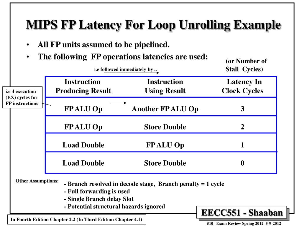 Instruction Producing Result FP ALU Op FP ALU Op Load Double Load Double Instruction Using Result Another FP ALU Op Store Double FP ALU Op Store Double Latency In Clock Cycles 3 2 1 0 MIPS FP Latency For Loop Unrolling Example • All FP units assumed to be pipelined. • The following FP operations latencies are used: (or Number of Stall Cycles) i.e followed immediately by .. i.e 4 execution (EX) cycles for FP instructions Other Assumptions: - Branch resolved in decode stage, Branch penalty = 1 cycle - Full forwarding is used - Single Branch delay Slot - Potential structural hazards ignored In Fourth Edition Chapter 2.2 (In Third Edition Chapter 4.1)