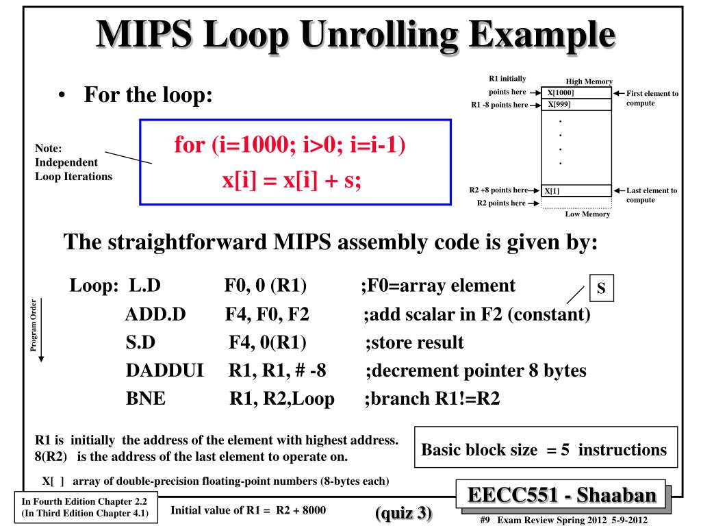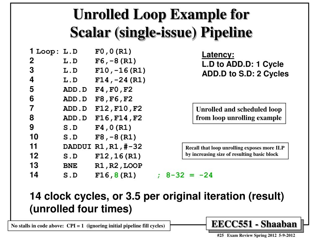 EECC551 Exam Review. 4 questions out of 6 questions (Must answer first 2 questions and 2 from remaining 4) Instruction Dependencies and graphs In-order Floating Point/Multicycle Pipelining (quiz 2) Improving Instruction-Level Parallelism (ILP). Loop-unrolling (quiz 3)