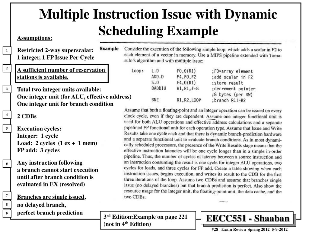 Multiple Instruction Issue with Dynamic Scheduling Example Assumptions: Restricted 2-way superscalar: 1 integer, 1 FP Issue Per Cycle A sufficient number of reservation stations is available. Total two integer units available: One integer unit (for ALU, effective address) One integer unit for branch condition 2 CDBs Execution cycles: Integer: 1 cycle Load: 2 cycles (1 ex + 1 mem) FP add: 3 cycles Any instruction following a branch cannot start execution until after branch condition is evaluated in EX (resolved) Branches are single issued, no delayed branch, perfect branch prediction 1 2 3 4 5 6 7 8 9 3rd Edition:Example on page 221 (not in 4th Edition)