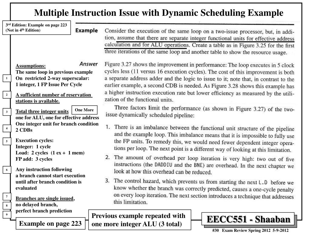 (Start) BNE Single Issue BNE Single Issue BNE Single Issue Both CDBs are used here (in cycles 4, 8) FP EX = 3 cycles Same three loop Iterations on Restricted 2-way Superscalar Tomasulo but with Three integer units (one for ALU, one for effective address calculation, one for branch condition) 16 cycles here vs. 19 cycles (with two integer units) 3rd Edition:page 224 (not in 4th Edition For instructions after a branch: Execution starts after branch is resolved