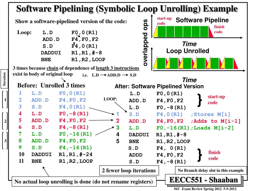 Loop: L.D F0,0(R1) ADD.D F4,F0,F2 S.D F4,0(R1) DADDUI R1,R1,#-8 BNE R1,R2,LOOP i.e. L.D ADD.D S.D Software Pipeline 1 2 3 start-up code overlapped ops Time finish code Loop Unrolled Time Software Pipelining (Symbolic Loop Unrolling) Example Show a software-pipelined version of the code: Before: Unrolled 3 times 1 L.D F0,0(R1) 2 ADD.D F4,F0,F2 3 S.D F4,0(R1) 4 L.D F0,-8(R1) 5 ADD.D F4,F0,F2 6 S.D F4,-8(R1) 7 L.D F0,-16(R1) 8 ADD.D F4,F0,F2 9 S.D F4,-16(R1) 10 DADDUI R1,R1,#-24 11 BNE R1,R2,LOOP 3 times because chain of dependence of length 3 instructions exist in body of original loop Iteration After: Software Pipelined Version L.D F0,0(R1) ADD.D F4,F0,F2 L.D F0,-8(R1) 1 S.D F4,0(R1) ;Stores M[i] 2 ADD.D F4,F0,F2 ;Adds to M[i-1] 3 L.D F0,-16(R1);Loads M[i-2] 4 DADDUI R1,R1,#-8 5 BNE R1,R2,LOOP S.D F4, 0(R1) ADDD F4,F0,F2 S.D F4,-8(R1) } start-up code LOOP: } finish code 2 fewer loop iterations No Branch delay slot in this example No actual loop unrolling is done (do not rename registers)