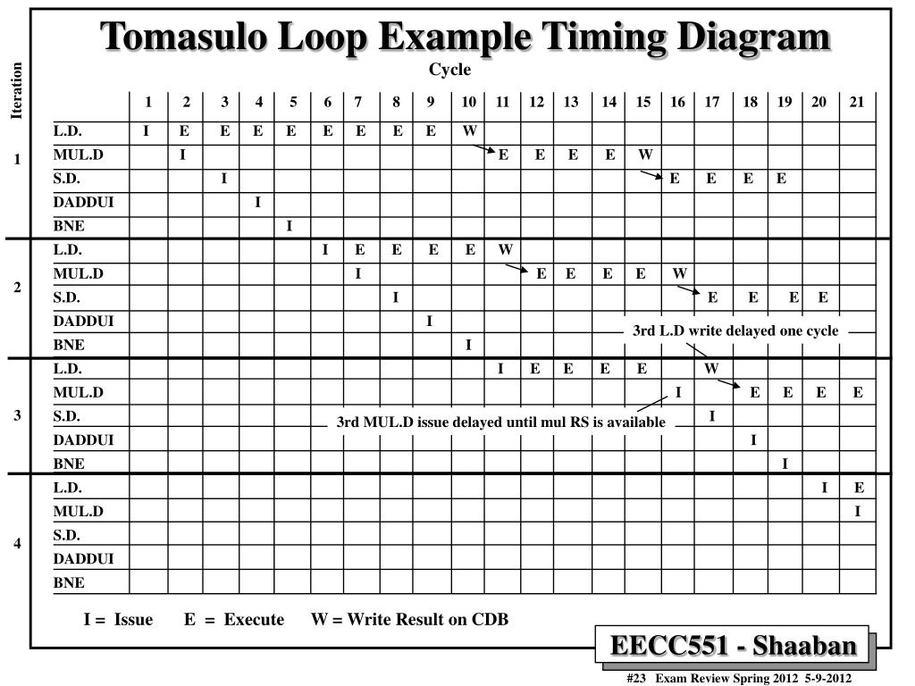 1 2 3 4 5 6 7 8 9 10 11 12 13 14 15 16 17 18 19 20 21 L.D. I E E E E E E E E W MUL.D I E E E E W S.D. I E E E E DADDUI I BNE I L.D. I E E E E W MUL.D I E E E E W S.D. I E E E E DADDUI I BNE I L.D. I E E E E W MUL.D I E E E E S.D. I DADDUI I BNE I L.D. I E MUL.D I S.D. DADDUI BNE Tomasulo Loop Example Timing Diagram Cycle Iteration 1 2 3 4 3rd L.D write delayed one cycle 3rd MUL.D issue delayed until mul RS is available I = Issue E = Execute W = Write Result on CDB