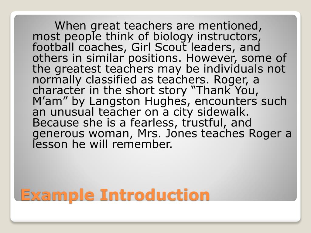 When great teachers are mentioned, most people think of biology instructors, football coaches, Girl Scout leaders, and others in similar positions. However, some of the greatest teachers may be individuals not normally classified as teachers. Roger, a character in the short story “Thank You, M’am” by Langston Hughes, encounters such an unusual teacher on a city sidewalk. Because she is a fearless, trustful, and generous woman, Mrs. Jones teaches Roger a lesson he will remember. Example Introduction