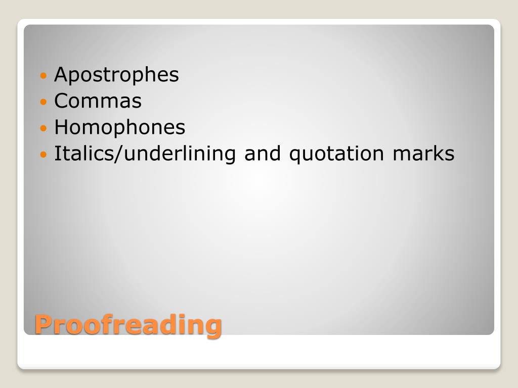 Apostrophes • Commas • Homophones • Italics/underlining and quotation marks Proofreading