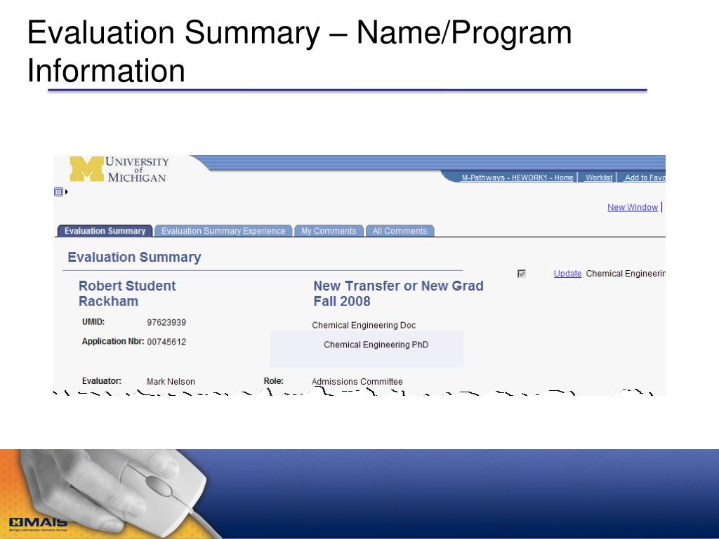 Maintaining On-Line Evaluations in MPathways • Student Services staff need to assign applications to faculty once the application is deemed complete; simple assignment process • Data and Images do not need to be ‘ported’ to side system – everything is real-time • Minimal one-time setup required to ‘turn this on’ for a unit • MAIS and Rackham provide on-going consulting to units to help them with this process