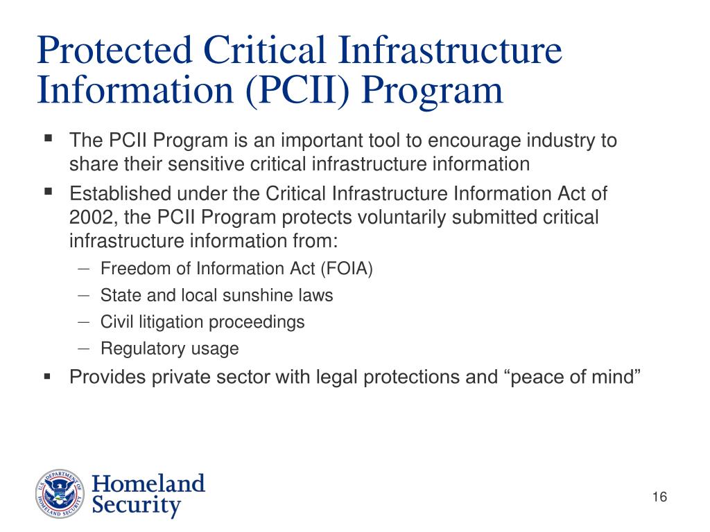 The PCII Program is an important tool to encourage industry to share their sensitive critical infrastructure information Established under the Critical Infrastructure Information Act of 2002, the PCII Program protects voluntarily submitted critical infrastructure information from: Freedom of Information Act (FOIA) State and local sunshine laws Civil litigation proceedings Regulatory usage Provides private sector with legal protections and “peace of mind” Protected Critical Infrastructure Information (PCII) Program