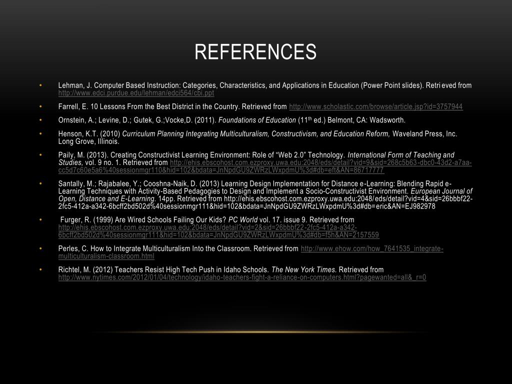 References • Lehman, J. Computer Based Instruction: Categories, Characteristics, and Applications in Education (Power Point slides). Retrieved from http://www.edci.purdue.edu/lehman/edci564/cbi.ppt • Farrell, E. 10 Lessons From the Best District in the Country. Retrieved from http://www.scholastic.com/browse/article.jsp?id=3757944 • Ornstein, A.; Levine, D.; Gutek, G.;Vocke,D. (2011). Foundations of Education (11th ed.) Belmont, CA: Wadsworth. • Henson, K.T. (2010) Curriculum Planning Integrating Multiculturalism, Constructivism, and Education Reform, Waveland Press, Inc. Long Grove, Illinois. • Paily, M. (2013). Creating Constructivist Learning Environment: Role of “Web 2.0” Technology. International Form of Teaching and Studies, vol. 9 no. 1. Retrieved from http://ehis.ebscohost.com.ezproxy.uwa.edu:2048/eds/detail?vid=9&sid=268c5b63-dbc0-43d2-a7aa-cc5d7c60e5a6%40sessionmgr110&hid=102&bdata=JnNpdGU9ZWRzLWxpdmU%3d#db=eft&AN=86717777 • Santally, M.; Rajabalee, Y.; Cooshna-Naik, D. (2013) Learning Design Implementation for Distance e-Learning: Blending Rapid e-Learning Techniques with Activity-Based Pedagogies to Design and Implement a Socio-Constructivist Environment. European Journal of Open, Distance and E-Learning. 14pp. Retrieved from http://ehis.ebscohost.com.ezproxy.uwa.edu:2048/eds/detail?vid=4&sid=26bbbf22-2fc5-412a-a342-6bcff2bd502d%40sessionmgr111&hid=102&bdata=JnNpdGU9ZWRzLWxpdmU%3d#db=eric&AN=EJ982978 • Furger, R. (1999) Are Wired Schools Failing Our Kids? PC World vol. 17. issue 9. Retrieved from http://ehis.ebscohost.com.ezproxy.uwa.edu:2048/eds/detail?vid=2&sid=26bbbf22-2fc5-412a-a342-6bcff2bd502d%40sessionmgr111&hid=102&bdata=JnNpdGU9ZWRzLWxpdmU%3d#db=f5h&AN=2157559 • Perles, C. How to Integrate Multiculturalism Into the Classroom. Retrieved from http://www.ehow.com/how_7641535_integrate-multiculturalism-classroom.html • Richtel, M. (2012) Teachers Resist High Tech Push in Idaho Schools. The New York Times. Retrieved from http://www.nytimes.com/2012/01/04/technology/idaho-teachers-fight-a-reliance-on-computers.html?pagewanted=all&_r=0