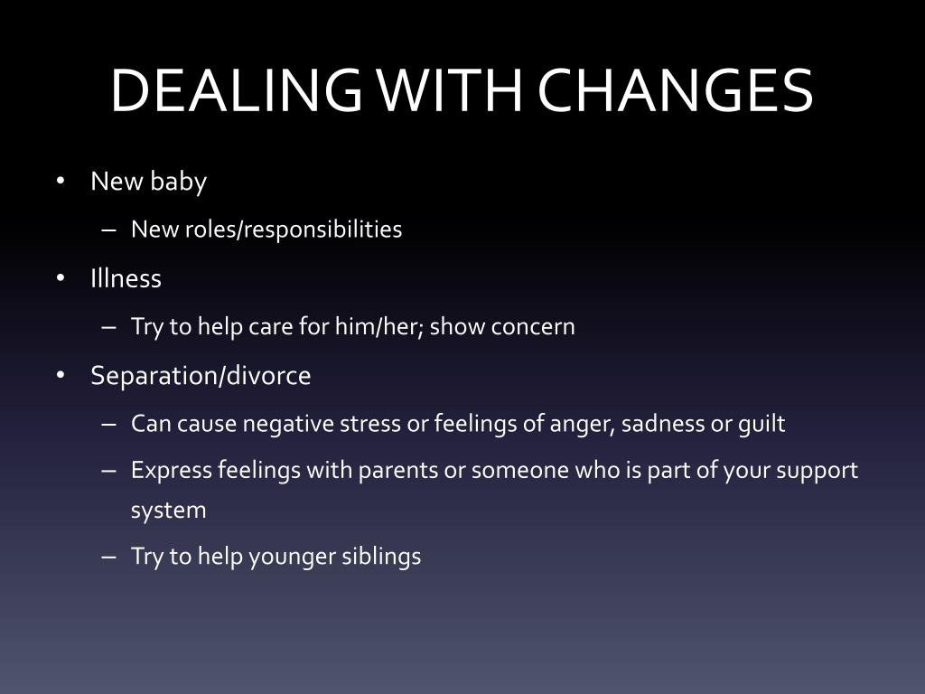 DEALING WITH CHANGES • New baby • New roles/responsibilities • Illness • Try to help care for him/her; show concern • Separation/divorce • Can cause negative stress or feelings of anger, sadness or guilt • Express feelings with parents or someone who is part of your support system • Try to help younger siblings