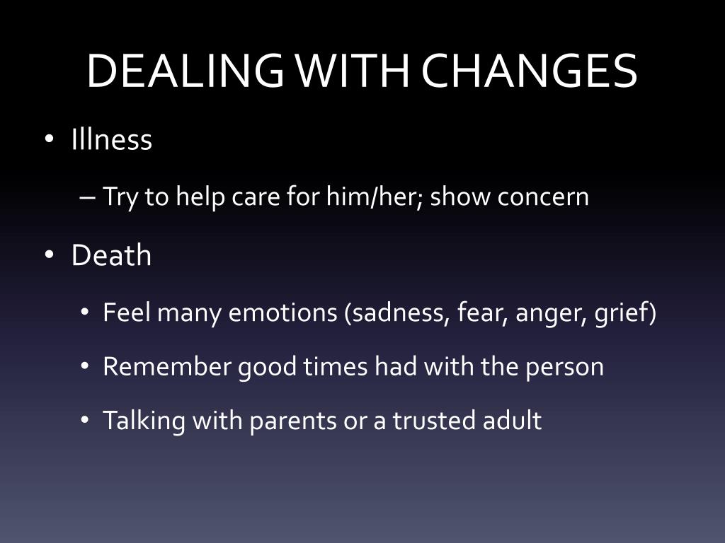 DEALING WITH CHANGES • Illness • Try to help care for him/her; show concern • Death • Feel many emotions (sadness, fear, anger, grief) • Remember good times had with the person • Talking with parents or a trusted adult