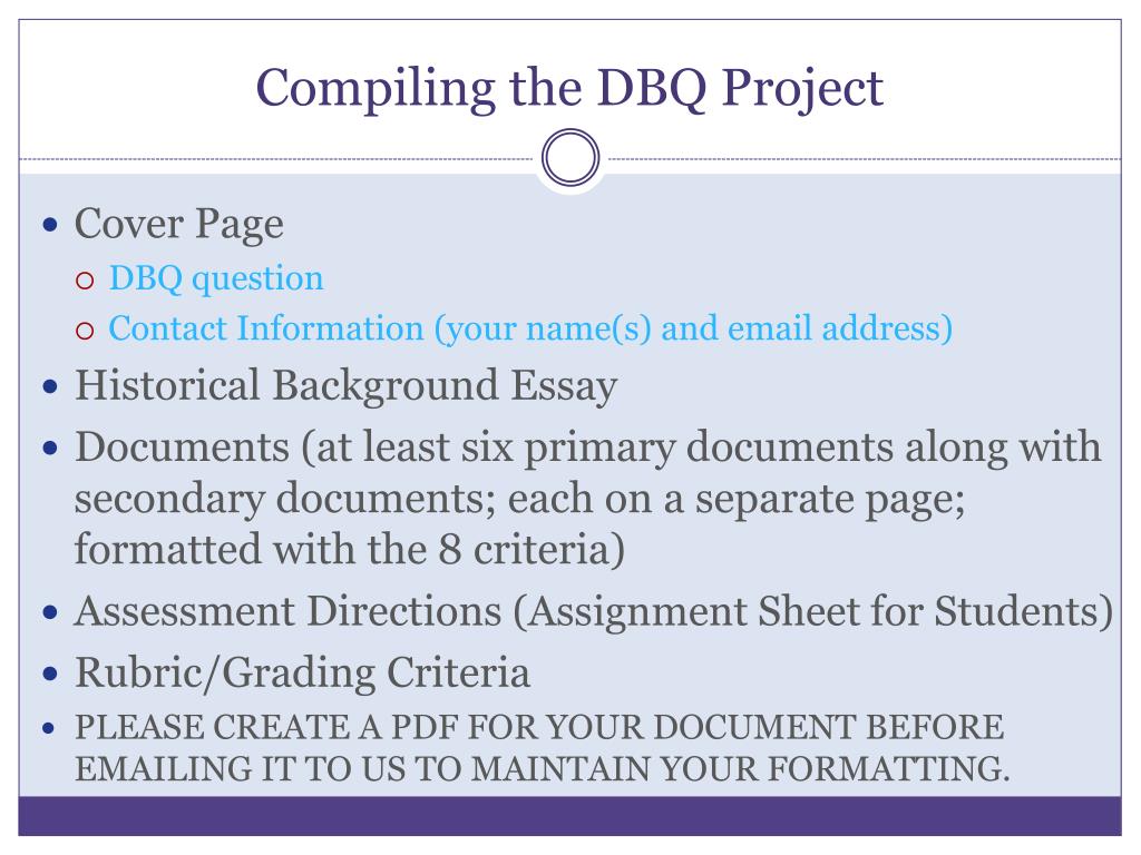 Compiling the DBQ Project • Cover Page • DBQ question • Contact Information (your name(s) and email address) • Historical Background Essay • Documents (at least six primary documents along with secondary documents; each on a separate page; formatted with the 8 criteria) • Assessment Directions (Assignment Sheet for Students) • Rubric/Grading Criteria • PLEASE CREATE A PDF FOR YOUR DOCUMENT BEFORE EMAILING IT TO US TO MAINTAIN YOUR FORMATTING.