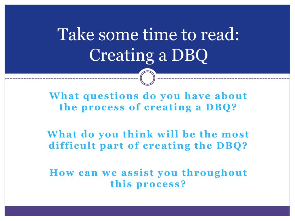 Take some time to read: Creating a DBQ What questions do you have about the process of creating a DBQ? What do you think will be the most difficult part of creating the DBQ? How can we assist you throughout this process?