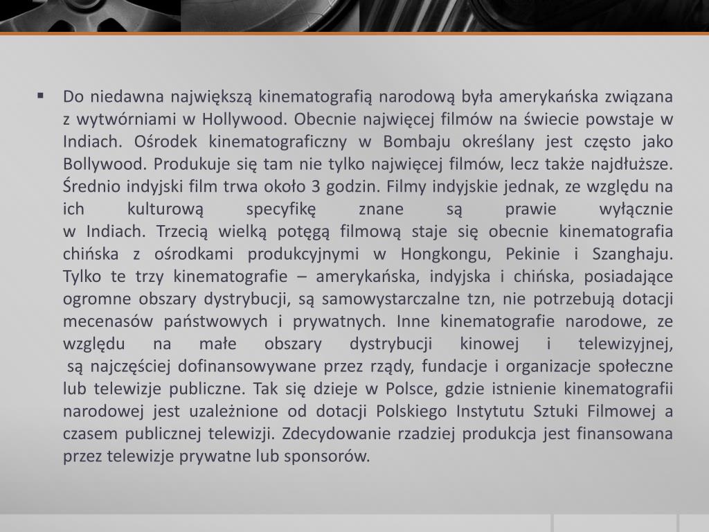 Do niedawna największą kinematografią narodową była amerykańska związana z wytwórniami w Hollywood. Obecnie najwięcej filmów na świecie powstaje w Indiach. Ośrodek kinematograficzny w Bombaju określany jest często jako Bollywood. Produkuje się tam nie tylko najwięcej filmów, lecz także najdłuższe. Średnio indyjski film trwa około 3 godzin. Filmy indyjskie jednak, ze względu na ich kulturową specyfikę znane są prawie wyłącznie w Indiach. Trzecią wielką potęgą filmową staje się obecnie kinematografia chińska z ośrodkami produkcyjnymi w Hongkongu, Pekinie i Szanghaju. Tylko te trzy kinematografie – amerykańska, indyjska i chińska, posiadające ogromne obszary dystrybucji, są samowystarczalne tzn, nie potrzebują dotacji mecenasów państwowych i prywatnych. Inne kinematografie narodowe, ze względu na małe obszary dystrybucji kinowej i telewizyjnej,są najczęściej dofinansowywane przez rządy, fundacje i organizacje społeczne lub telewizje publiczne. Tak się dzieje w Polsce, gdzie istnienie kinematografii narodowej jest uzależnione od dotacji Polskiego Instytutu Sztuki Filmowej a czasem publicznej telewizji. Zdecydowanie rzadziej produkcja jest finansowana przez telewizje prywatne lub sponsorów.