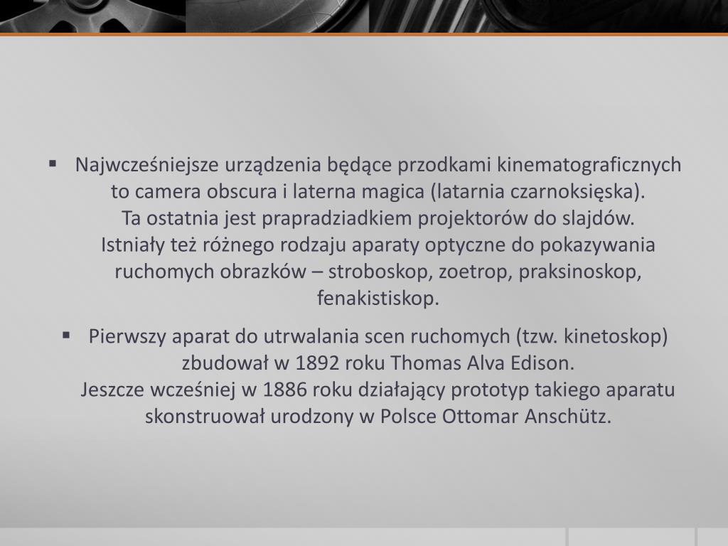Najwcześniejsze urządzenia będące przodkami kinematograficznych to camera obscura i laterna magica (latarnia czarnoksięska). Ta ostatnia jest prapradziadkiem projektorów do slajdów. Istniały też różnego rodzaju aparaty optyczne do pokazywania ruchomych obrazków – stroboskop, zoetrop, praksinoskop, fenakistiskop. • Pierwszy aparat do utrwalania scen ruchomych (tzw. kinetoskop) zbudował w 1892 roku Thomas Alva Edison. Jeszcze wcześniej w 1886 roku działający prototyp takiego aparatu skonstruował urodzony w Polsce Ottomar Anschütz.