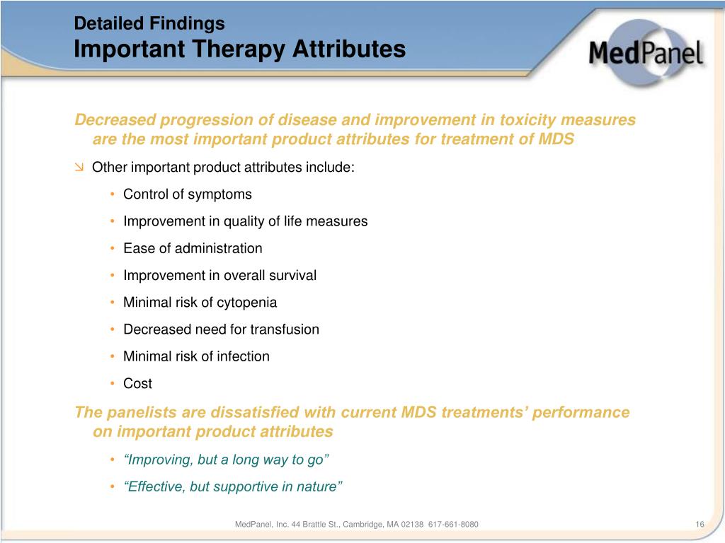 Detailed FindingsImportant Therapy Attributes Decreased progression of disease and improvement in toxicity measures are the most important product attributes for treatment of MDS • Other important product attributes include: • Control of symptoms • Improvement in quality of life measures • Ease of administration • Improvement in overall survival • Minimal risk of cytopenia • Decreased need for transfusion • Minimal risk of infection • Cost The panelists are dissatisfied with current MDS treatments’ performance on important product attributes • “Improving, but a long way to go” • “Effective, but supportive in nature”
