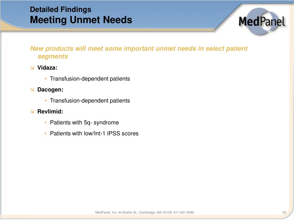 Detailed FindingsMeeting Unmet Needs New products will meet some important unmet needs in select patient segments • Vidaza: • Transfusion-dependent patients • Dacogen: • Transfusion-dependent patients • Revlimid: • Patients with 5q- syndrome • Patients with low/Int-1 IPSS scores