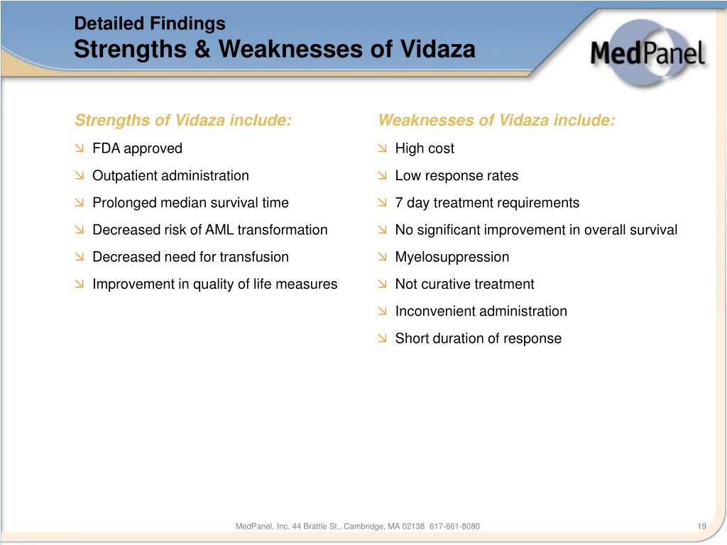 Detailed FindingsStrengths & Weaknesses of Vidaza Strengths of Vidaza include: • FDA approved • Outpatient administration • Prolonged median survival time • Decreased risk of AML transformation • Decreased need for transfusion • Improvement in quality of life measures Weaknesses of Vidaza include: • High cost • Low response rates • 7 day treatment requirements • No significant improvement in overall survival • Myelosuppression • Not curative treatment • Inconvenient administration • Short duration of response