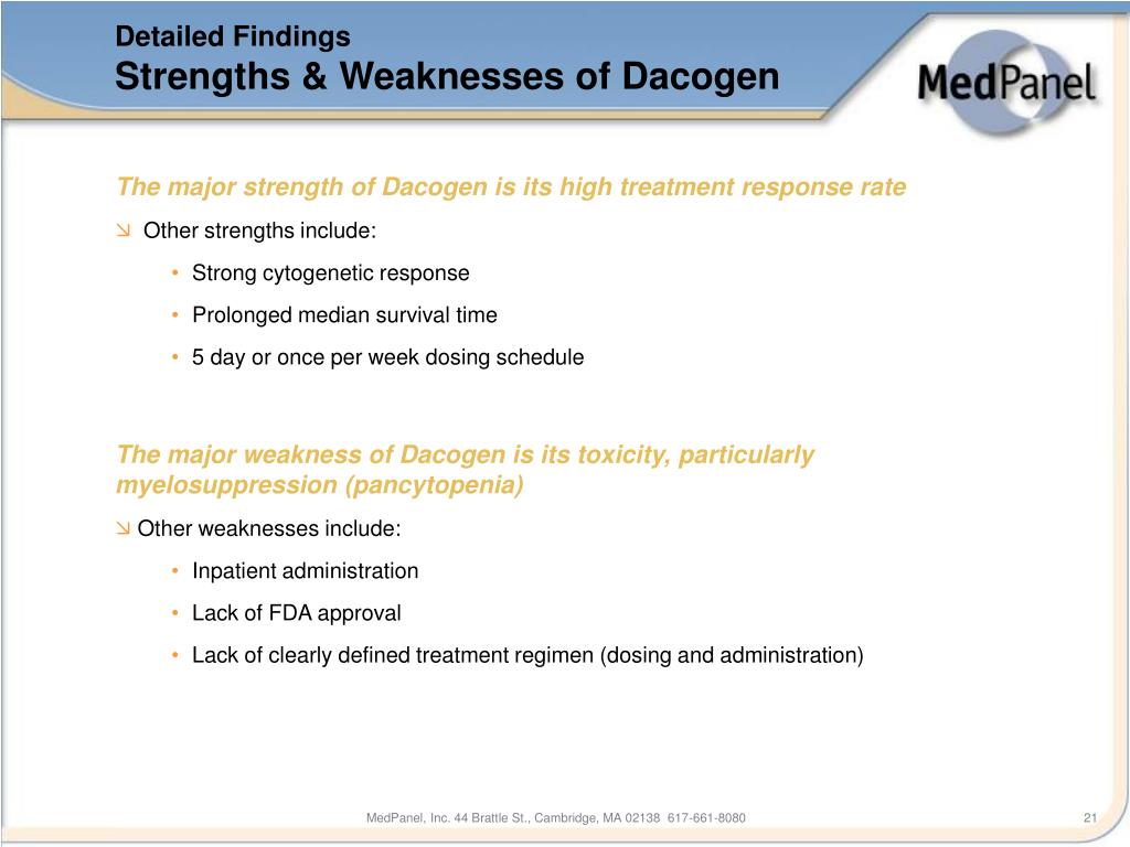 Detailed FindingsStrengths & Weaknesses of Dacogen The major strength of Dacogen is its high treatment response rate • Other strengths include: • Strong cytogenetic response • Prolonged median survival time • 5 day or once per week dosing schedule The major weakness of Dacogen is its toxicity, particularly myelosuppression (pancytopenia) • Other weaknesses include: • Inpatient administration • Lack of FDA approval • Lack of clearly defined treatment regimen (dosing and administration)