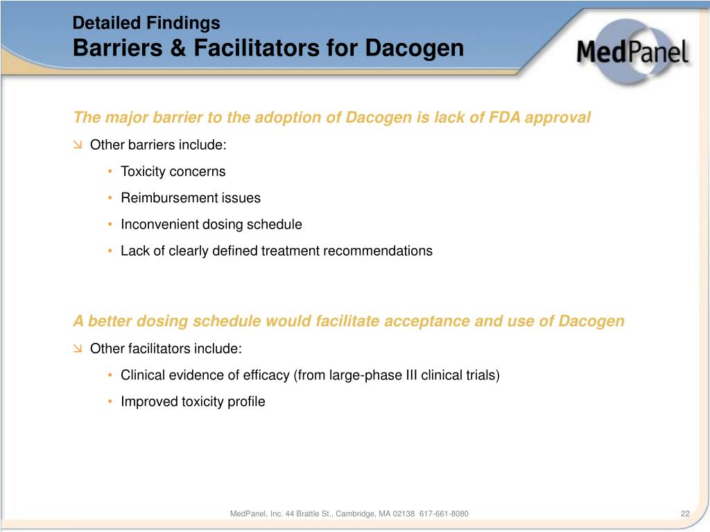 Detailed FindingsBarriers & Facilitators for Dacogen The major barrier to the adoption of Dacogen is lack of FDA approval • Other barriers include: • Toxicity concerns • Reimbursement issues • Inconvenient dosing schedule • Lack of clearly defined treatment recommendations A better dosing schedule would facilitate acceptance and use of Dacogen • Other facilitators include: • Clinical evidence of efficacy (from large-phase III clinical trials) • Improved toxicity profile