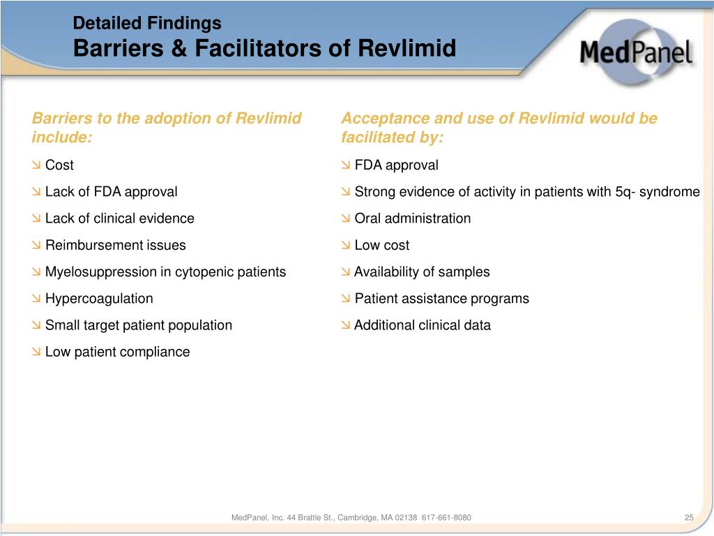 Detailed FindingsBarriers & Facilitators of Revlimid Barriers to the adoption of Revlimid include: • Cost • Lack of FDA approval • Lack of clinical evidence • Reimbursement issues • Myelosuppression in cytopenic patients • Hypercoagulation • Small target patient population • Low patient compliance Acceptance and use of Revlimid would be facilitated by: • FDA approval • Strong evidence of activity in patients with 5q- syndrome • Oral administration • Low cost • Availability of samples • Patient assistance programs • Additional clinical data