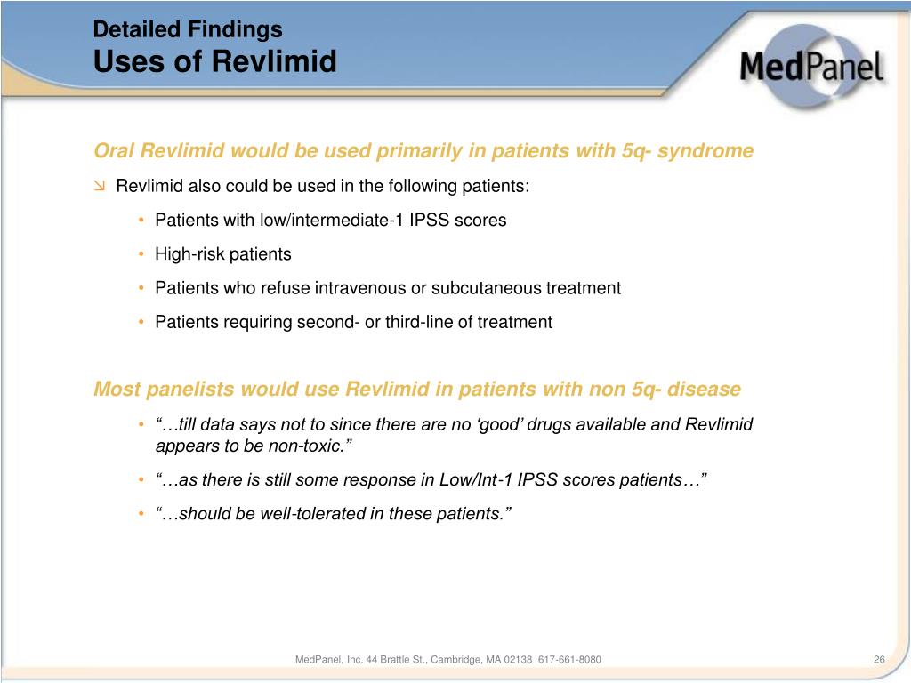 Detailed FindingsUses of Revlimid Oral Revlimid would be used primarily in patients with 5q- syndrome • Revlimid also could be used in the following patients: • Patients with low/intermediate-1 IPSS scores • High-risk patients • Patients who refuse intravenous or subcutaneous treatment • Patients requiring second- or third-line of treatment Most panelists would use Revlimid in patients with non 5q- disease • “…till data says not to since there are no ‘good’ drugs available and Revlimid appears to be non-toxic.” • “…as there is still some response in Low/Int-1 IPSS scores patients…” • “…should be well-tolerated in these patients.”