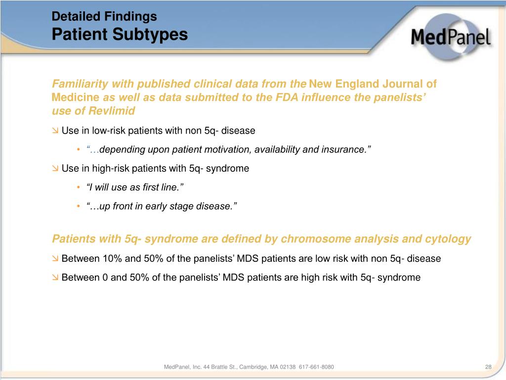 Detailed FindingsPatient Subtypes Familiarity with published clinical data from the New England Journal of Medicine as well as data submitted to the FDA influence the panelists’ use of Revlimid • Use in low-risk patients with non 5q- disease • “…depending upon patient motivation, availability and insurance.” • Use in high-risk patients with 5q- syndrome • “I will use as first line.” • “…up front in early stage disease.” Patients with 5q- syndrome are defined by chromosome analysis and cytology • Between 10% and 50% of the panelists’ MDS patients are low risk with non 5q- disease • Between 0 and 50% of the panelists’ MDS patients are high risk with 5q- syndrome