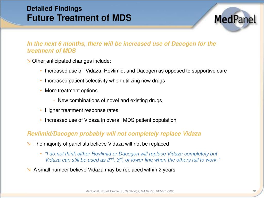 Detailed FindingsFuture Treatment of MDS In the next 6 months, there will be increased use of Dacogen for the treatment of MDS • Other anticipated changes include: • Increased use of Vidaza, Revlimid, and Dacogen as opposed to supportive care • Increased patient selectivity when utilizing new drugs • More treatment options • New combinations of novel and existing drugs • Higher treatment response rates • Increased use of Vidaza in overall MDS patient population Revlimid/Dacogen probably will not completely replace Vidaza • The majority of panelists believe Vidaza will not be replaced • “I do not think either Revlimid or Dacogen will replace Vidaza completely but Vidaza can still be used as 2nd, 3rd, or lower line when the others fail to work.” • A small number believe Vidaza may be replaced within 2 years
