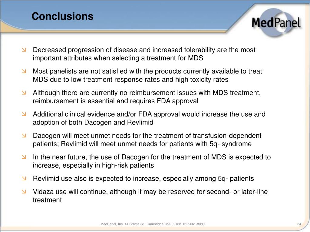 Conclusions • Decreased progression of disease and increased tolerability are the most important attributes when selecting a treatment for MDS • Most panelists are not satisfied with the products currently available to treat MDS due to low treatment response rates and high toxicity rates • Although there are currently no reimbursement issues with MDS treatment, reimbursement is essential and requires FDA approval • Additional clinical evidence and/or FDA approval would increase the use and adoption of both Dacogen and Revlimid • Dacogen will meet unmet needs for the treatment of transfusion-dependent patients; Revlimid will meet unmet needs for patients with 5q- syndrome • In the near future, the use of Dacogen for the treatment of MDS is expected to increase, especially in high-risk patients • Revlimid use also is expected to increase, especially among 5q- patients • Vidaza use will continue, although it may be reserved for second- or later-line treatment