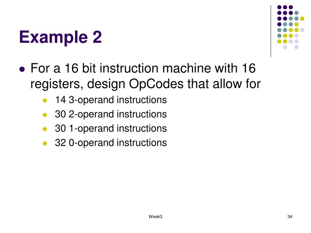 Example 2 • For a 16 bit instruction machine with 16 registers, design OpCodes that allow for • 14 3-operand instructions • 30 2-operand instructions • 30 1-operand instructions • 32 0-operand instructions Week3