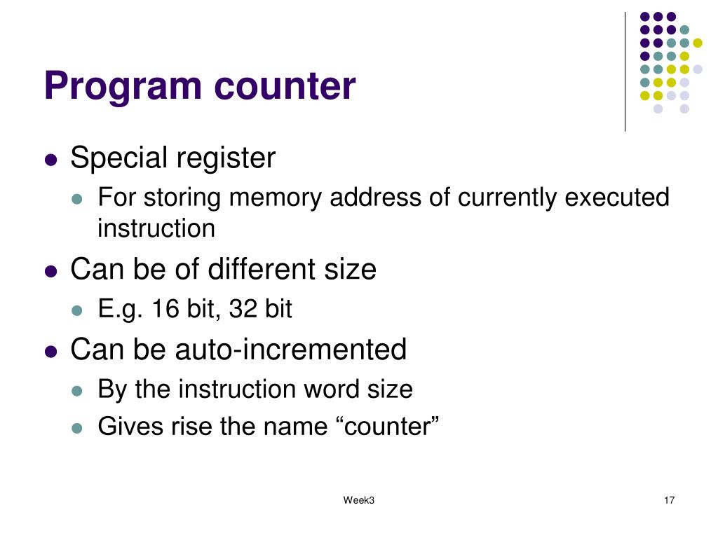 Program counter • Special register • For storing memory address of currently executed instruction • Can be of different size • E.g. 16 bit, 32 bit • Can be auto-incremented • By the instruction word size • Gives rise the name “counter” Week3