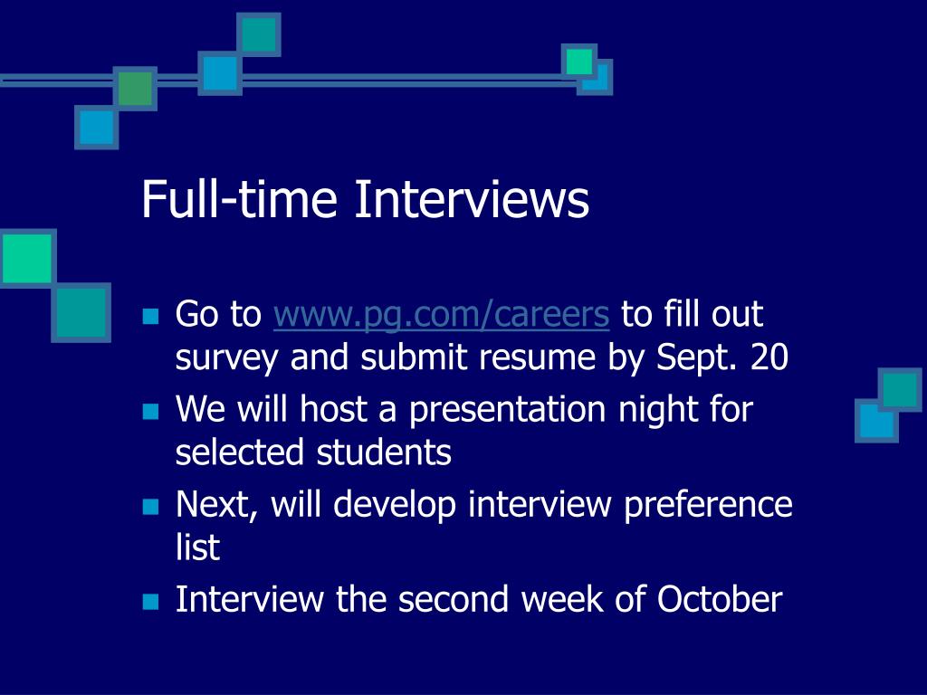 Full-time Interviews • Go to www.pg.com/careers to fill out survey and submit resume by Sept. 20 • We will host a presentation night for selected students • Next, will develop interview preference list • Interview the second week of October