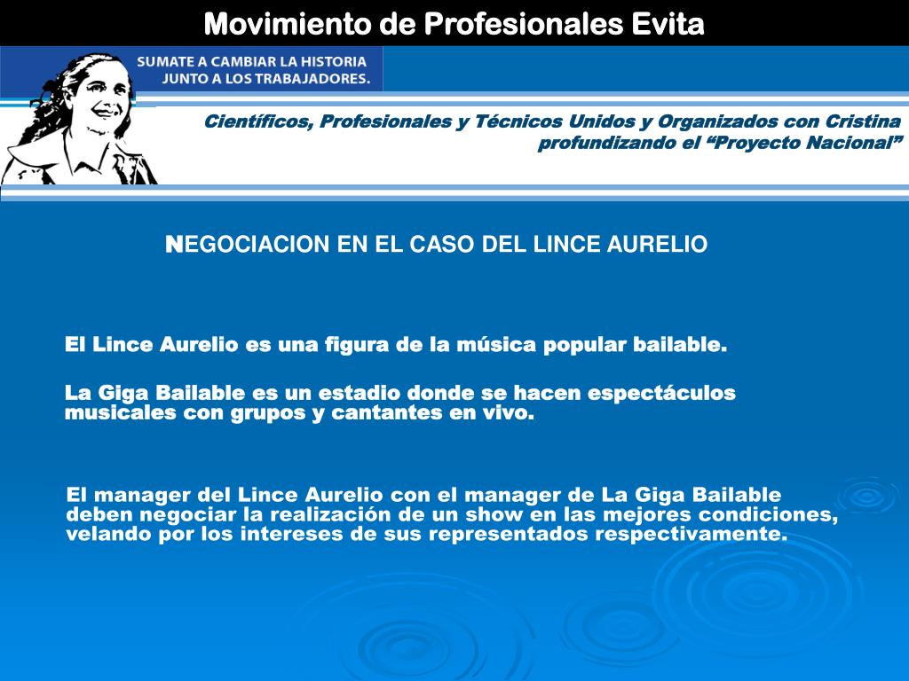 Movimiento de Profesionales Evita Científicos, Profesionales y Técnicos Unidos y Organizados con Cristina profundizando el “Proyecto Nacional” NEGOCIACION EN EL CASO DEL LINCE AURELIO El Lince Aurelio es una figura de la música popular bailable. La Giga Bailable es un estadio donde se hacen espectáculos musicales con grupos y cantantes en vivo. El manager del Lince Aurelio con el manager de La Giga Bailable deben negociar la realización de un show en las mejores condiciones, velando por los intereses de sus representados respectivamente.