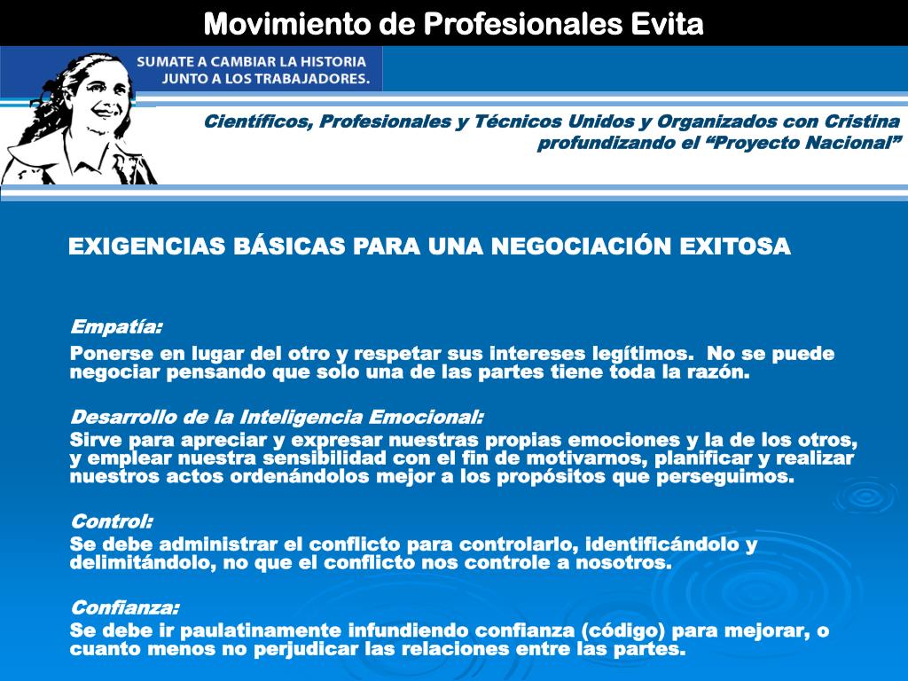 Movimiento de Profesionales Evita Científicos, Profesionales y Técnicos Unidos y Organizados con Cristina profundizando el “Proyecto Nacional” EXIGENCIAS BÁSICAS PARA UNA NEGOCIACIÓN EXITOSA Empatía: Ponerse en lugar del otro y respetar sus intereses legítimos. No se puede negociar pensando que solo una de las partes tiene toda la razón. Desarrollo de la Inteligencia Emocional: Sirve para apreciar y expresar nuestras propias emociones y la de los otros, y emplear nuestra sensibilidad con el fin de motivarnos, planificar y realizar nuestros actos ordenándolos mejor a los propósitos que perseguimos. Control: Se debe administrar el conflicto para controlarlo, identificándolo y delimitándolo, no que el conflicto nos controle a nosotros. Confianza: Se debe ir paulatinamente infundiendo confianza (código) para mejorar, o cuanto menos no perjudicar las relaciones entre las partes.