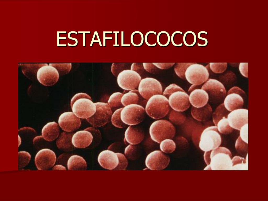 ESTAFILOCOCOS Staphylococcus epidermidis • Biota habitual de piel y mucosas humanas • Puede diseminarse a un sitio normalmente estéril, casi siempre resultado de implante de dispositivos médicos • La diseminación de persona a persona en los hospitales puede provocar la colonización de los pacientes