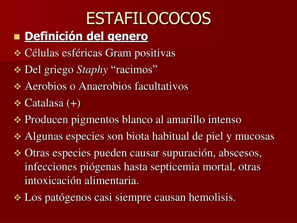 ESTAFILOCOCOS • Definición del genero • Células esféricas Gram positivas • Del griego Staphy “racimos” • Aerobios o Anaerobios facultativos • Catalasa (+) • Producen pigmentos blanco al amarillo intenso • Algunas especies son biota habitual de piel y mucosas • Otras especies pueden causar supuración, abscesos, infecciones piógenas hasta septicemia mortal, otras intoxicación alimentaria. • Los patógenos casi siempre causan hemolisis.