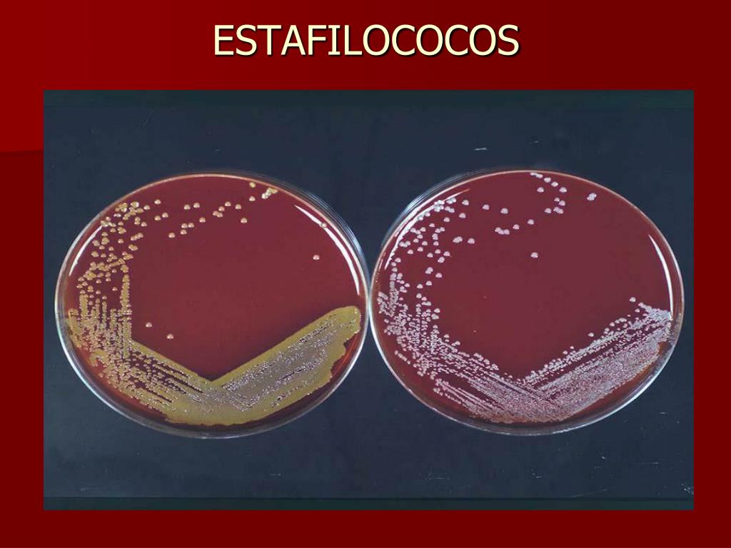 ESTAFILOCOCOS CULTIVO • Crecen bien en condiciones aeróbicas o anaeróbicas. • 37ºC pero su pigmento se produce mejor a 20-25ºC • En medios sólidos son colonias grises o amarillo dorado • Fermentan carbohidratos dando ácido láctico • Resisten hasta 50ºC 30 minutos y concentraciones de sal hasta 9% NaCl