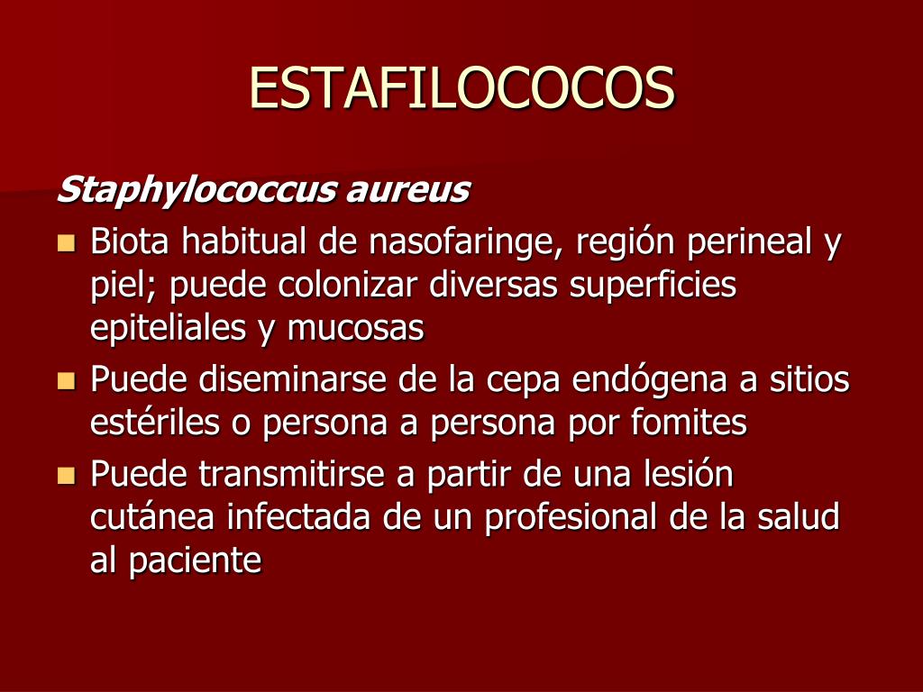 ESTAFILOCOCOS Staphylococcus aureus • Biota habitual de nasofaringe, región perineal y piel; puede colonizar diversas superficies epiteliales y mucosas • Puede diseminarse de la cepa endógena a sitios estériles o persona a persona por fomites • Puede transmitirse a partir de una lesión cutánea infectada de un profesional de la salud al paciente