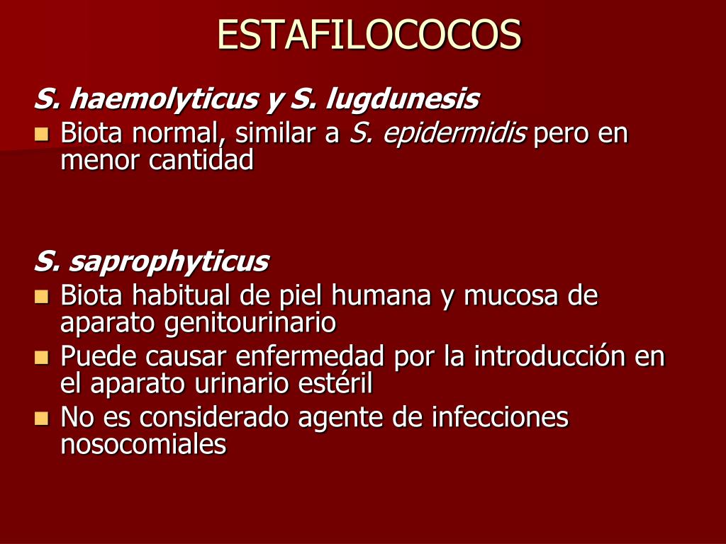 ESTAFILOCOCOS S. haemolyticus y S. lugdunesis • Biota normal, similar a S. epidermidis pero en menor cantidad S. saprophyticus • Biota habitual de piel humana y mucosa de aparato genitourinario • Puede causar enfermedad por la introducción en el aparato urinario estéril • No es considerado agente de infecciones nosocomiales