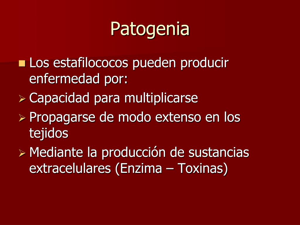 Patogenia • Los estafilococos pueden producir enfermedad por: • Capacidad para multiplicarse • Propagarse de modo extenso en los tejidos • Mediante la producción de sustancias extracelulares (Enzima – Toxinas)