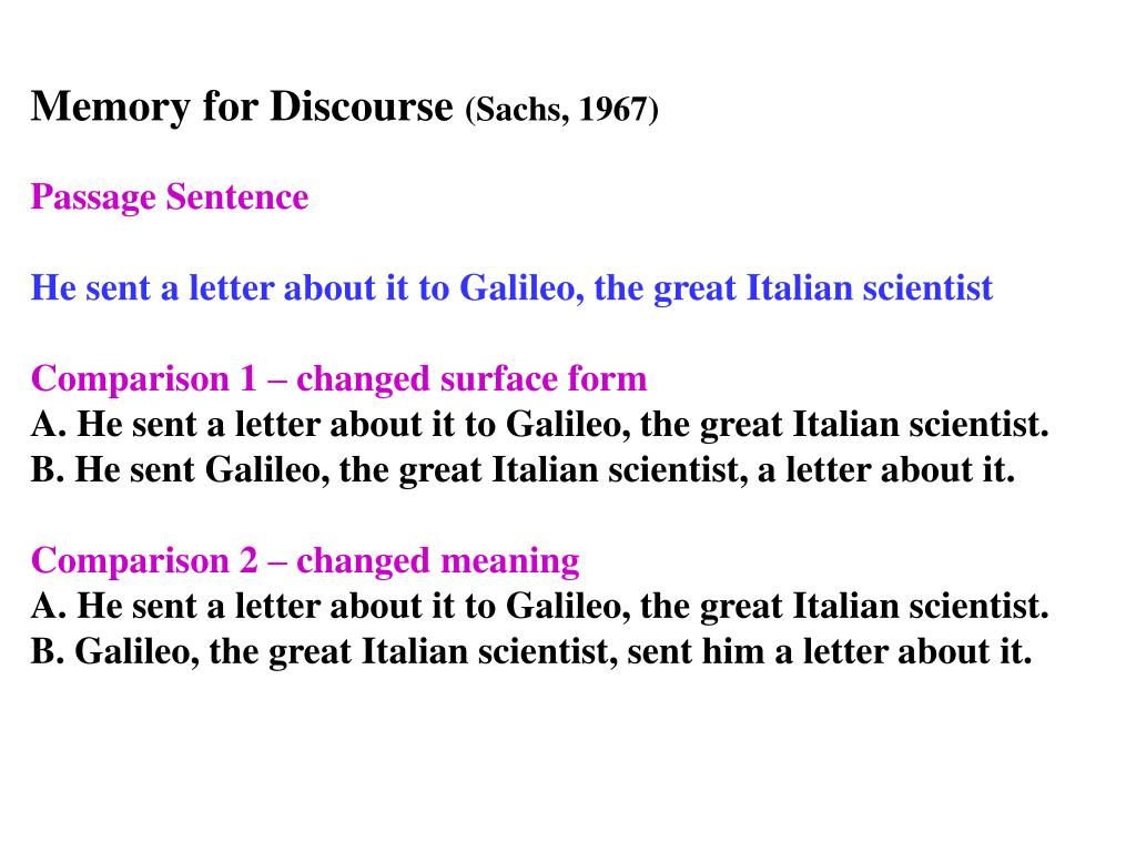 Memory for Discourse (Sachs, 1967) Passage Sentence He sent a letter about it to Galileo, the great Italian scientist Comparison 1 – changed surface form A. He sent a letter about it to Galileo, the great Italian scientist. B. He sent Galileo, the great Italian scientist, a letter about it. Comparison 2 – changed meaning A. He sent a letter about it to Galileo, the great Italian scientist. B. Galileo, the great Italian scientist, sent him a letter about it.
