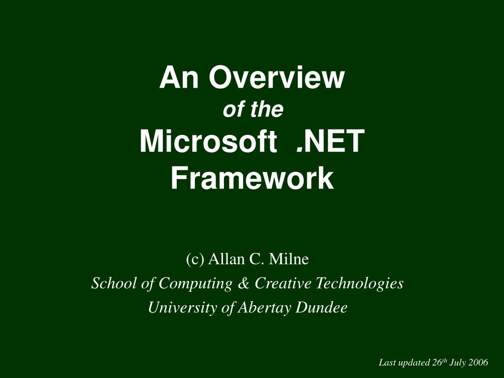 An Overview of the Microsoft . NET Framework. (c) Allan C. Milne School of Computing & Creative Technologies University of Abertay Dundee. Last updated 26 th July 2006. Agenda. What is .NET? Architecture overview Components of .NET Some concepts. So what is . NET ?.