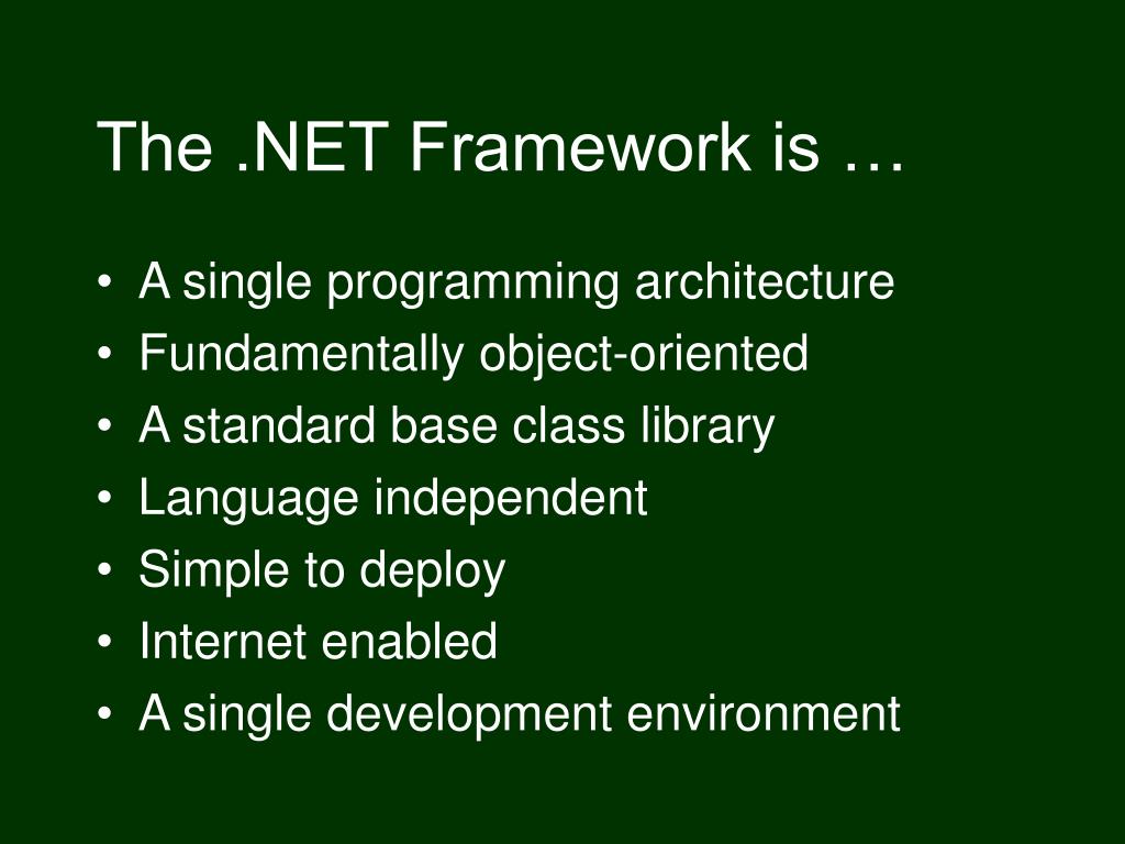 The .NET Framework is … • A single programming architecture • Fundamentally object-oriented • A standard base class library • Language independent • Simple to deploy • Internet enabled • A single development environment