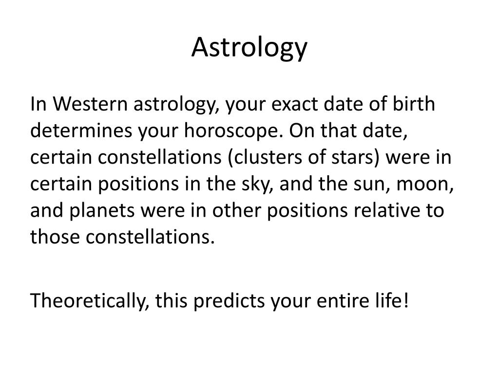 Astrology In Western astrology, your exact date of birth determines your horoscope. On that date, certain constellations (clusters of stars) were in certain positions in the sky, and the sun, moon, and planets were in other positions relative to those constellations. Theoretically, this predicts your entire life!