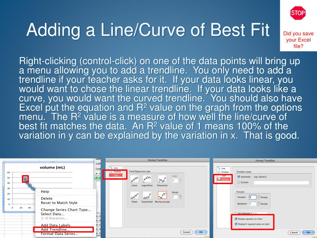 Adding a Line/Curve of Best Fit Right-clicking (control-click) on one of the data points will bring up a menu allowing you to add a trendline. You only need to add a trendline if your teacher asks for it. If your data looks linear, you would want to chose the linear trendline. If your data looks like a curve, you would want the curved trendline. You should also have Excel put the equation and R2 value on the graph from the options menu. The R2 value is a measure of how well the line/curve of best fit matches the data. An R2 value of 1 means 100% of the variation in y can be explained by the variation in x. That is good. Did you save your Excel file?